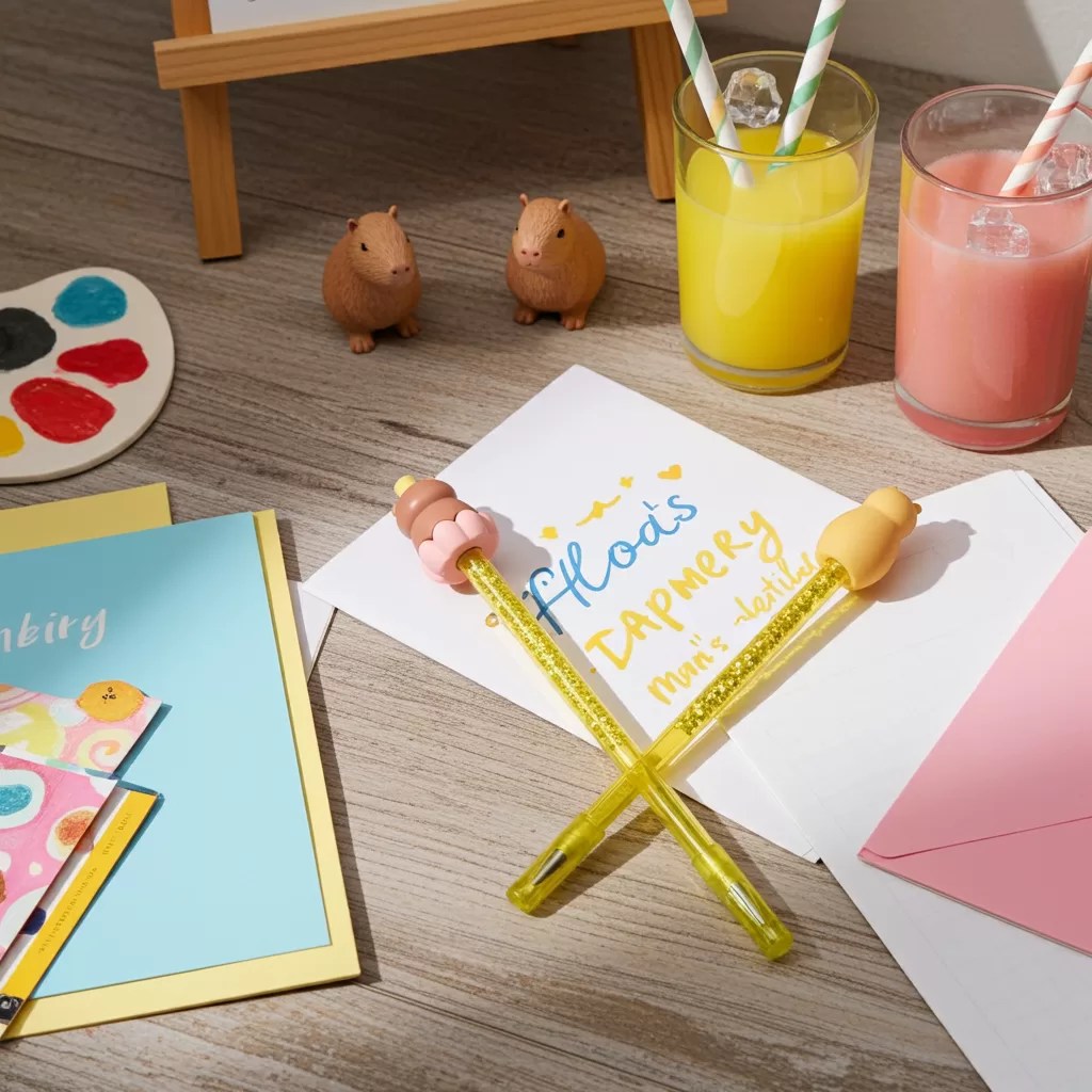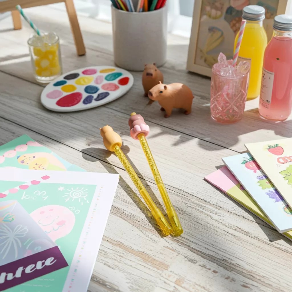 Transforme suas anotações com a Caneta em Gel Capivara, um item de papelaria que une funcionalidade, charme e um toque de luxo. Perfeita para quem ama o tema Capivara e a estética kawaii com brilho.